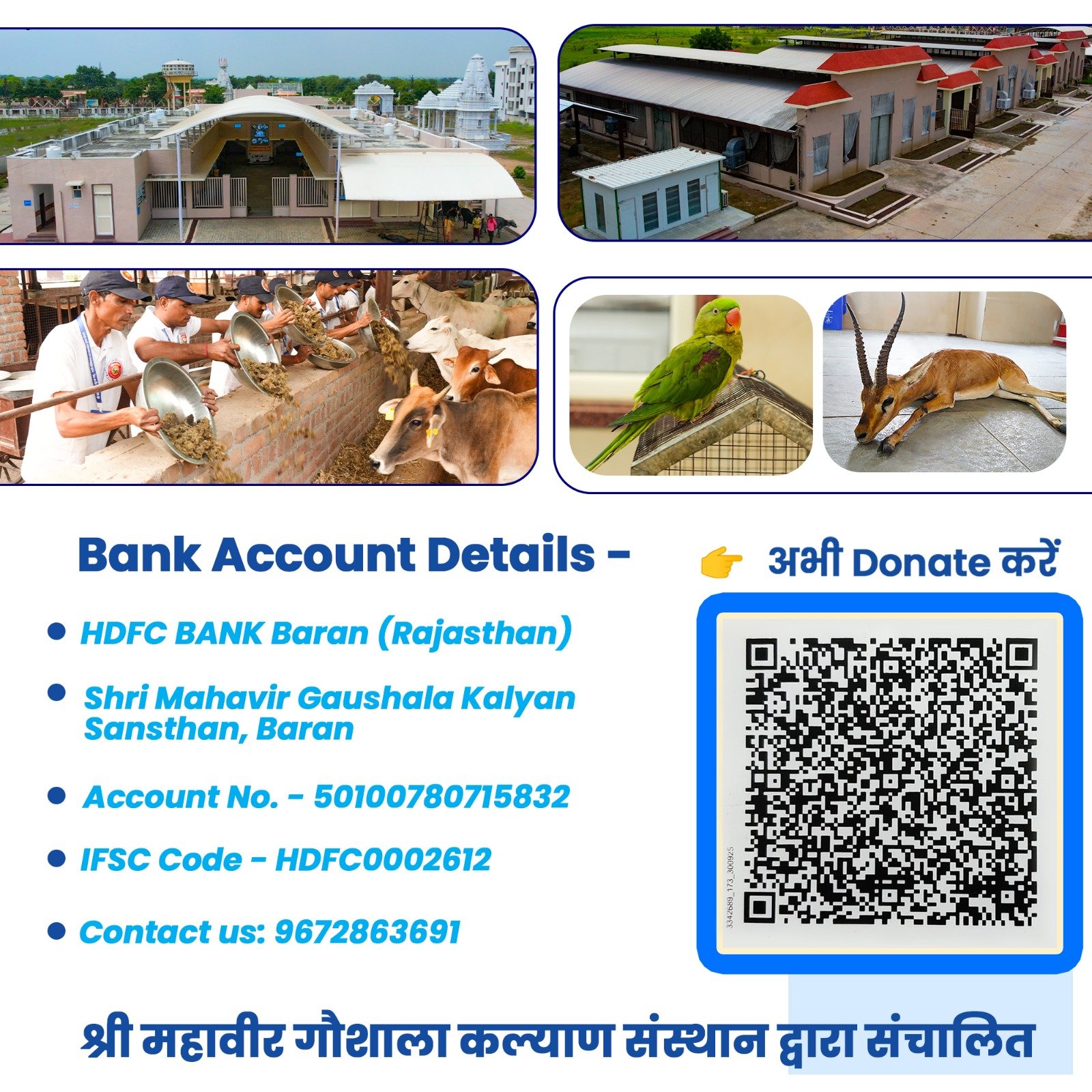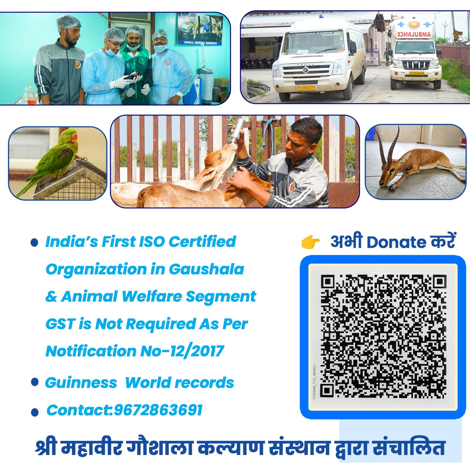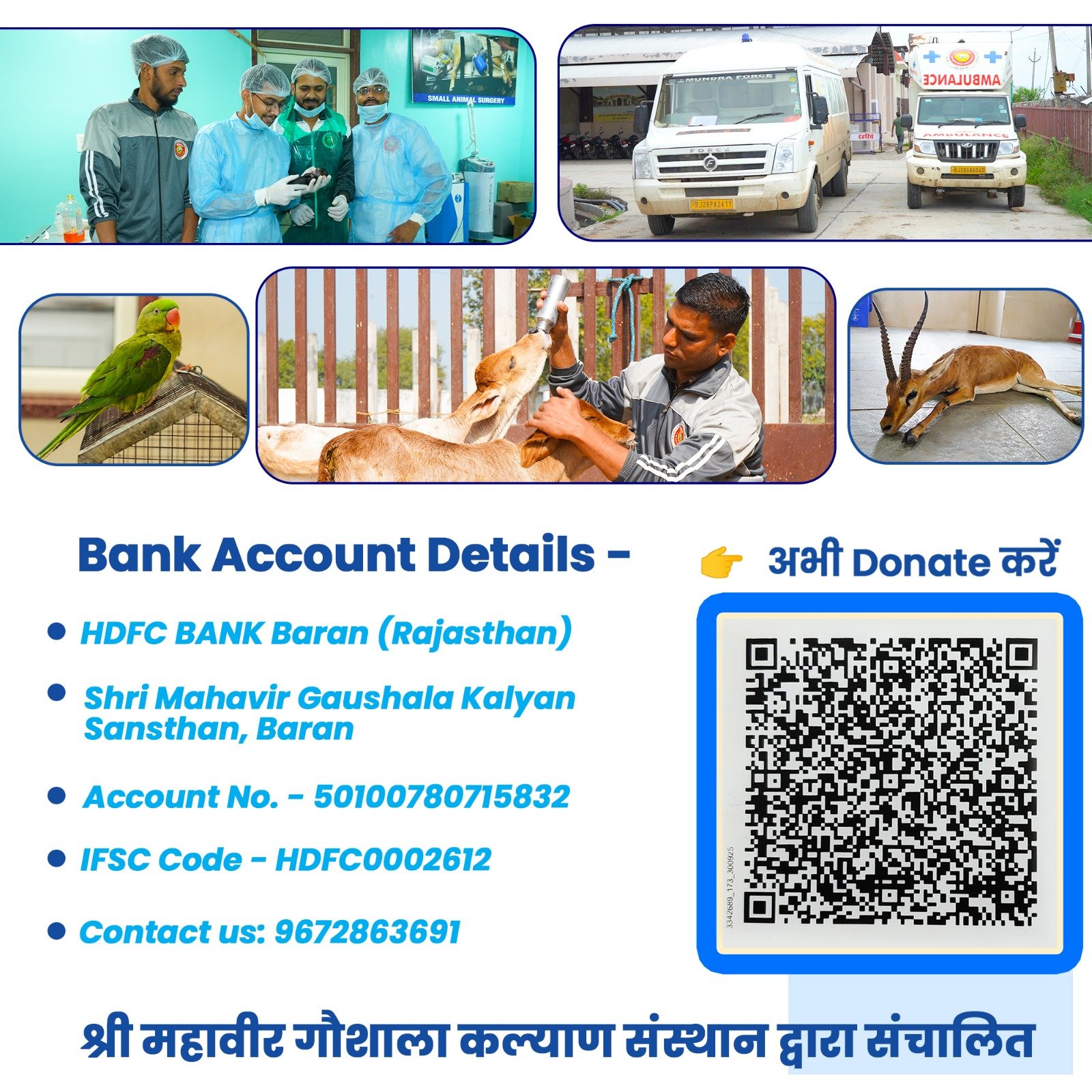 👉 श्री महावीर निःशुल्क पशु-पक्षी हॉस्पिटल एवं मोबाइल ट्रोमा सेंटर, बड़ा, जिला-बारां, राजस्थान, सेवा और करुणा का संदेश फैलाने के लिए समर्पित है। यहाँ घायल और बीमार पशुओं का निःशुल्क इलाज किया जाता है ताकि वे भी एक स्वस्थ और खुशहाल जीवन जी सकें।